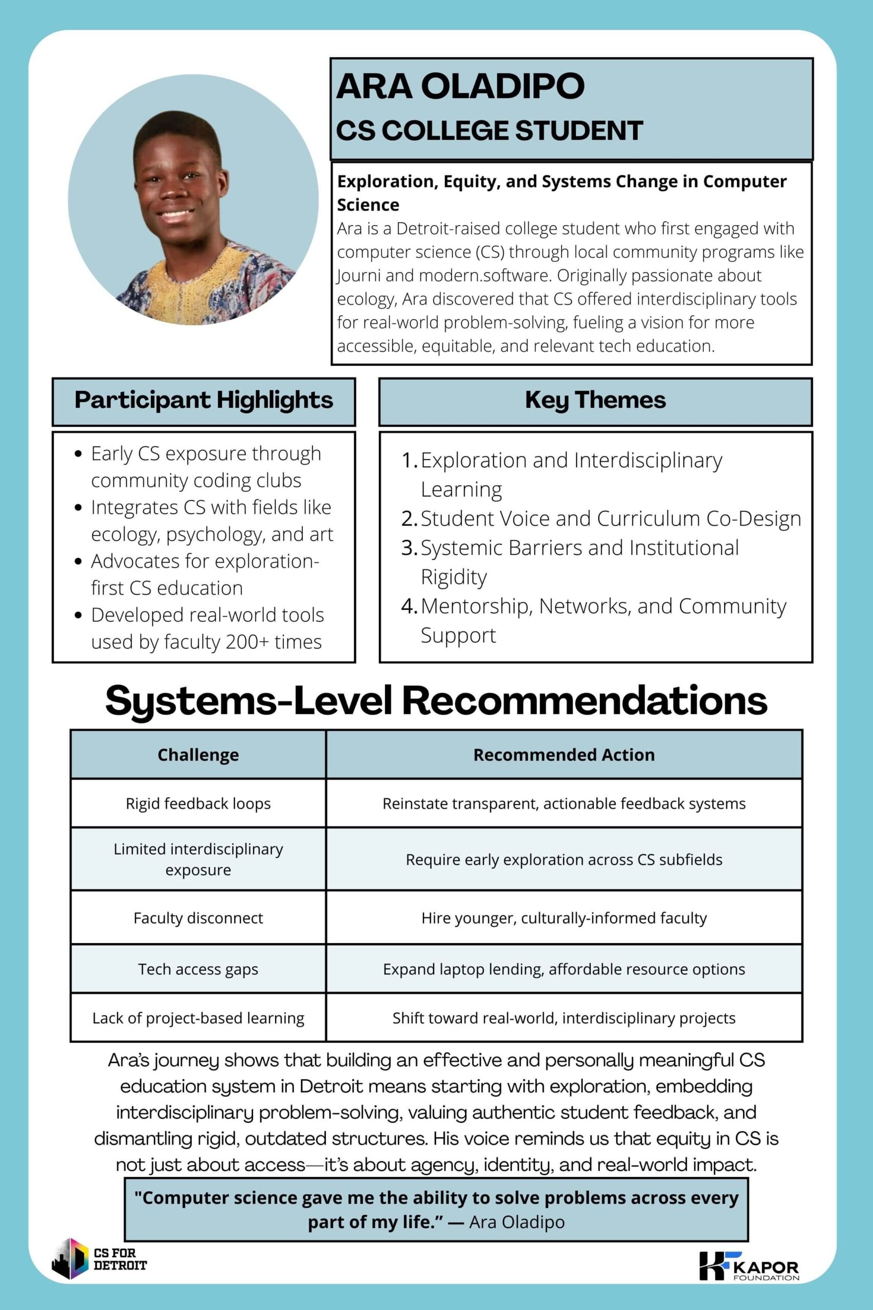 From October 2024 to June 2025, the Detroit Student Leadership Team (DSLT) designed and conducted a research project to explore how K12 computer science (CS) education in Detroit could better serve students, especially those whose voices are often left out of curriculum design and policy decisions. Guided by Dr. Chanel Beebe, the project centered youth as researchers and used oral history interviews to document lived experiences across the CS education ecosystem.